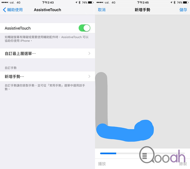 要使用的話很簡單,首先進入設定 -> 一般 -> 輔助使用 -> AssistiveTouch -> 開啟。接著再按一下「新增手勢」,然後劃出拋球手勢來錄製,你可以配合我們之前所教的 「L 法則」提升命中率,如下圖:
