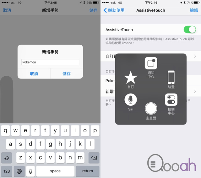 錄製好就按一下儲存,然後給予名稱,如「Pokemon」。當儲存好之後,按一下小白點,再進入自訂(星星圖案),再選取剛才錄好的手勢「Pokemon」。