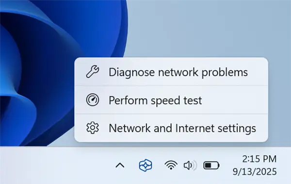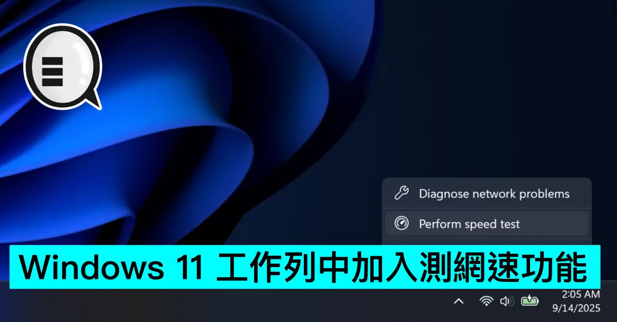 用戶滑鼠左擊 Windows 11 的工作列網絡圖標時,彈出的視窗新增了一個網速測試按鈕,位於右下角,在 Wi-Fi 刷新按鈕旁邊,可以快捷的進行網絡測試。