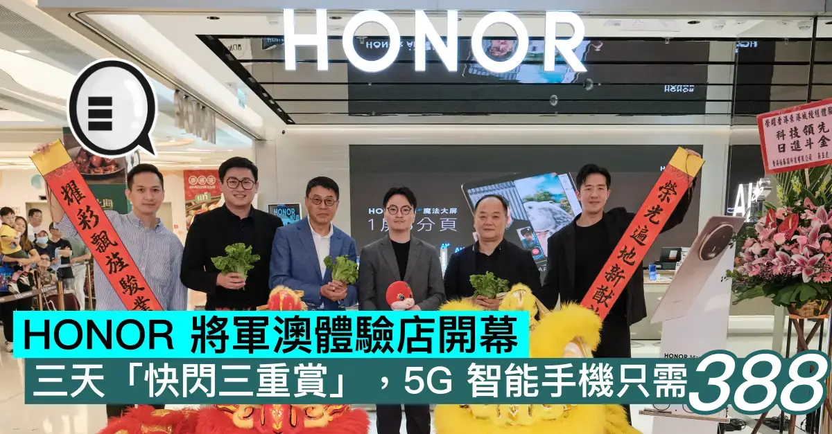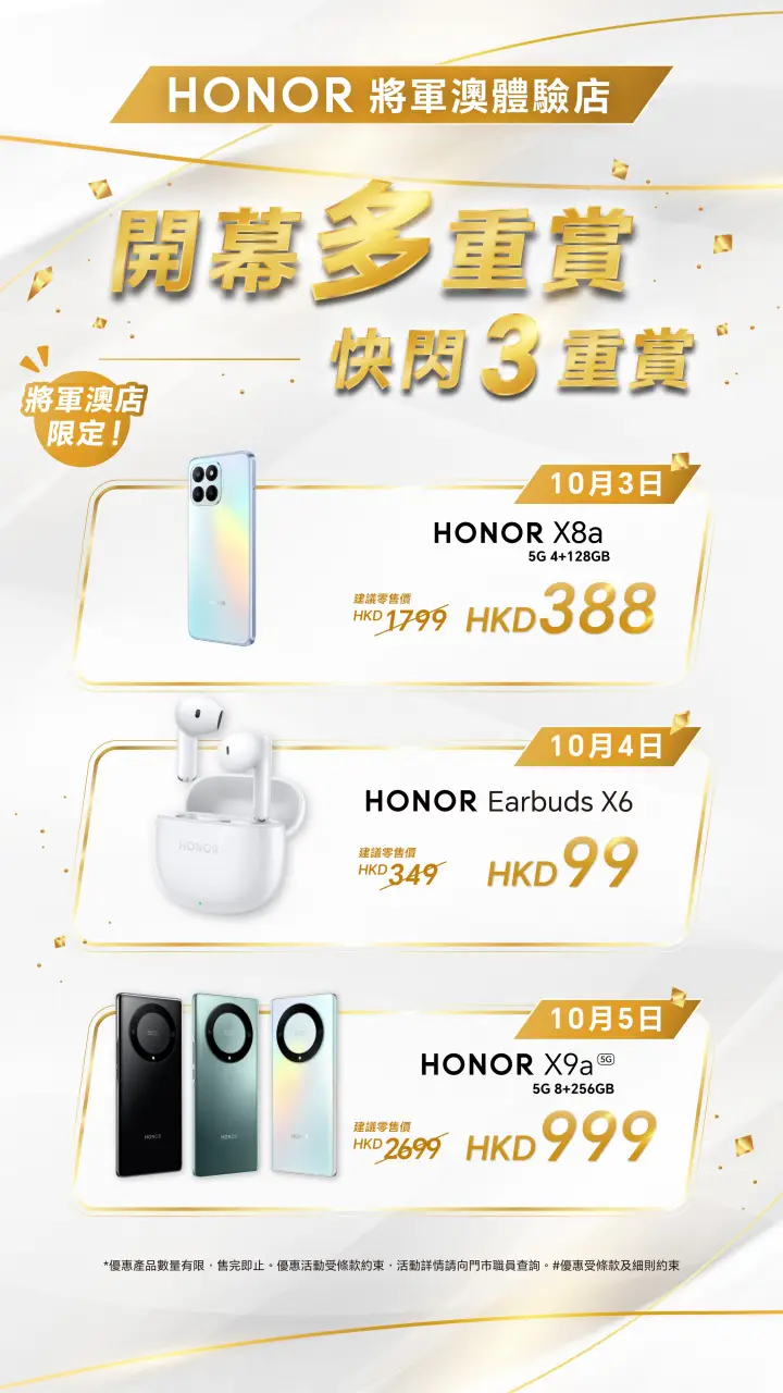 為慶祝新店開幕,HONOR 將軍澳體驗店(東港城)於即日起至10月5日期間,推出為期三天的「快閃三重賞」活動。顧客於活動期間在該店消費,即可以超值價格換購指定 HONOR 智能手機或耳機,具體優惠包括:10月3日,HONOR X8a 5G(4+128GB)僅售 HK$388(原價1799港元);10月4日,HONOR Earbuds X6 耳機售價 HK$99(原價349港元);10月5日,HONOR X9a 5G(8+256GB)售價 HK$999(原價2699港元)。