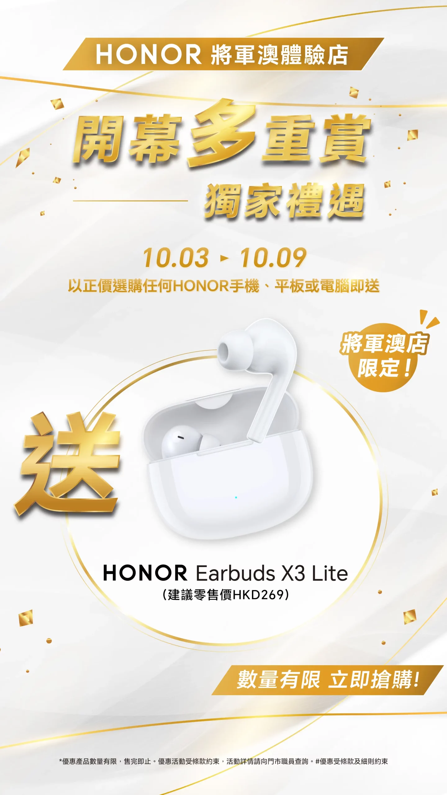 此外,即日起至10月9日,於將軍澳體驗店以正價購買任一款 HONOR 手機、平板或筆記型電腦的顧客,即可獲贈 HONOR Earbuds X3 Lite 耳機一副(原價 HK$269),數量有限,贈完即止。