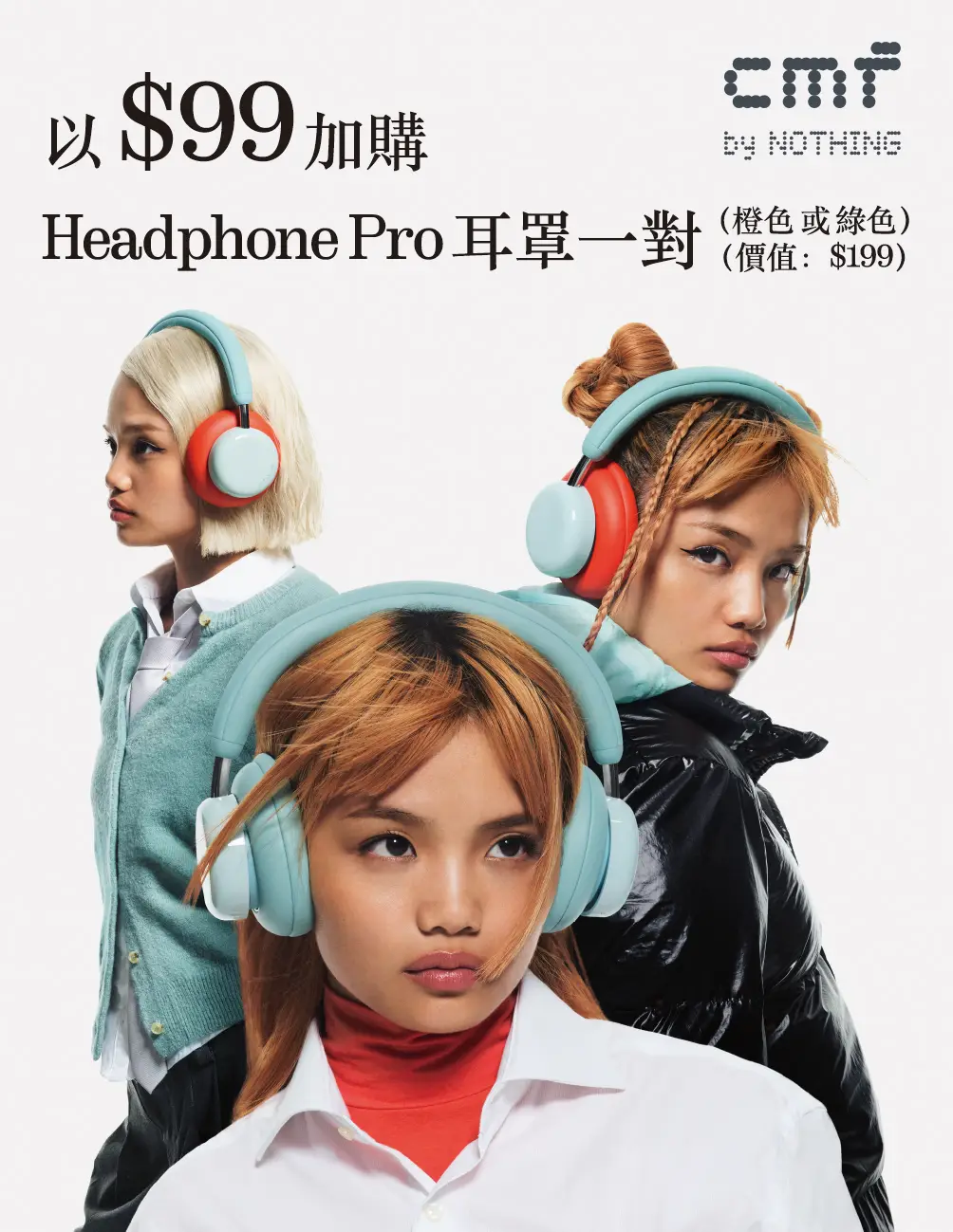 CMF Headphone Pro 將有深灰、淺灰與淺綠三個色。10月3日開始發售,定價 HK$799。CMF Headphone Pro 耳罩有橙色與淺綠色,定價HK$199。凡購買 CMF Headphone Pro,可以 HK$99 加購 Headphone Pro 耳罩(原價 HK$199)。可於香港1010、csl、豐澤 Fortress、指定零售商及澳門電訊購買。