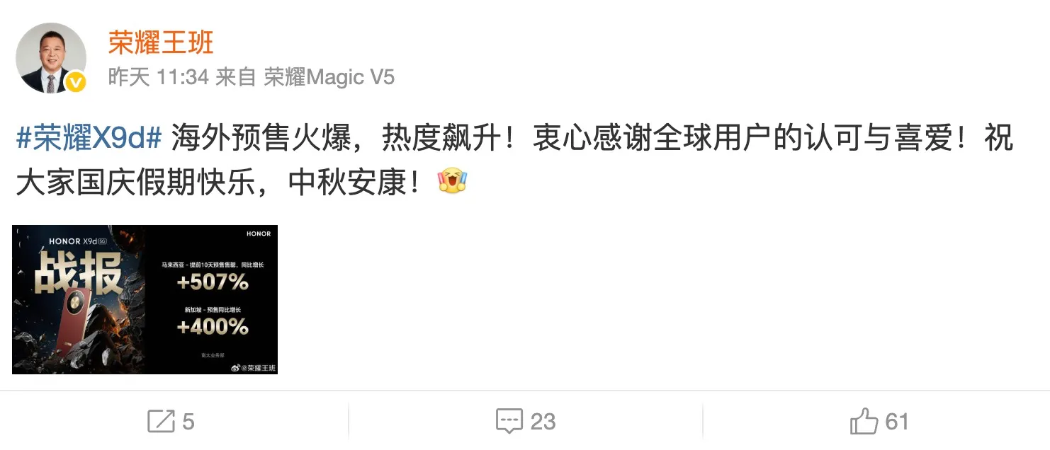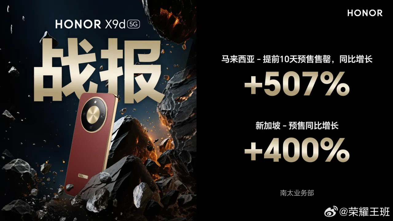 HONOR X9d 5G 手機在國際市場取得了優異的預售成績。根據 HONOR 終端股份有限公司銷售與服務總裁王班近日的分享,這款新機在 馬來西亞 和 新加坡 等地預售異常火爆,熱度迅速攀升。其中,馬來西亞市場不僅提前十天完成預售並售罄,預售量相比去年同期大幅增長了507%;新加坡市場也表現強勁,同比增長達到400%。