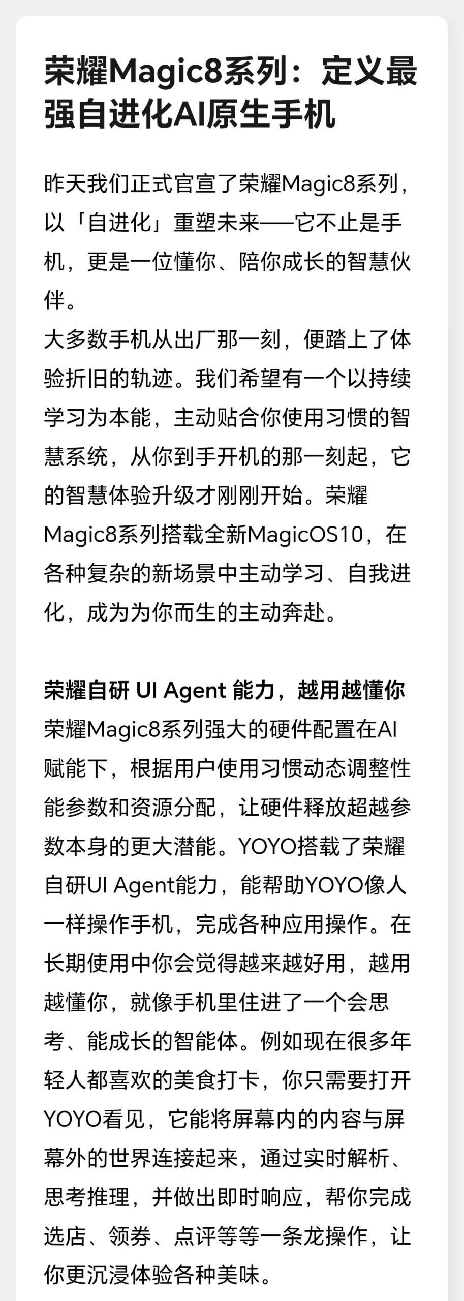 AI 體驗上,MagicOS 10 的升級同樣矚目。其搭載的自研 UI Agent 具備主動學習能力,能根據用戶使用習慣動態調整性能參數與資源分配,讓硬件性能突破參數限制,越用越順手。YOYO 助手更是進化為「全場景智能體」,可自動執行 3000 + 場景操作:從「一語打車」「一語修圖」等日常需求,到「匯總支出發郵件」「刪除模糊截圖」等複雜任務,均能一鍵完成。這一切都依託 HONOR 自研魔法大模型 3.0,真正讓 AI 融入日常生活細節。