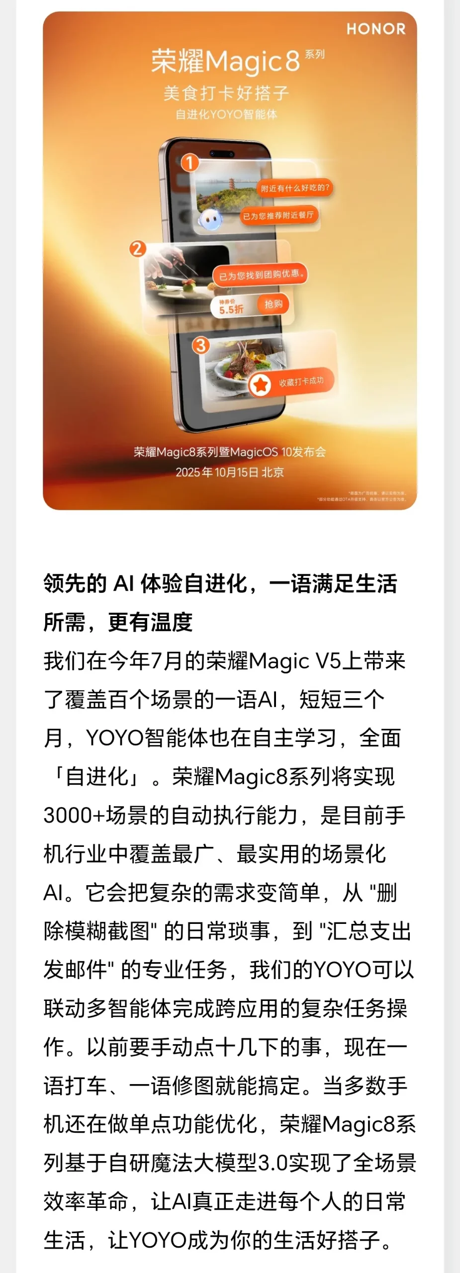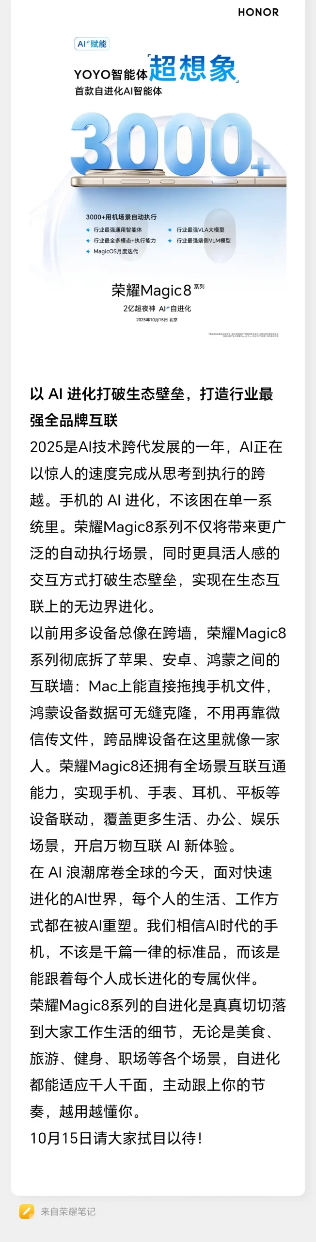 以「自進化」為核心的 HONOR Magic8 系列,不僅是一部手機,更致力於成為懂用戶、能成長的智慧夥伴。10 月 15 日的發佈會,將為行業帶來一場智慧生態的新變革,值得全球消費者期待。