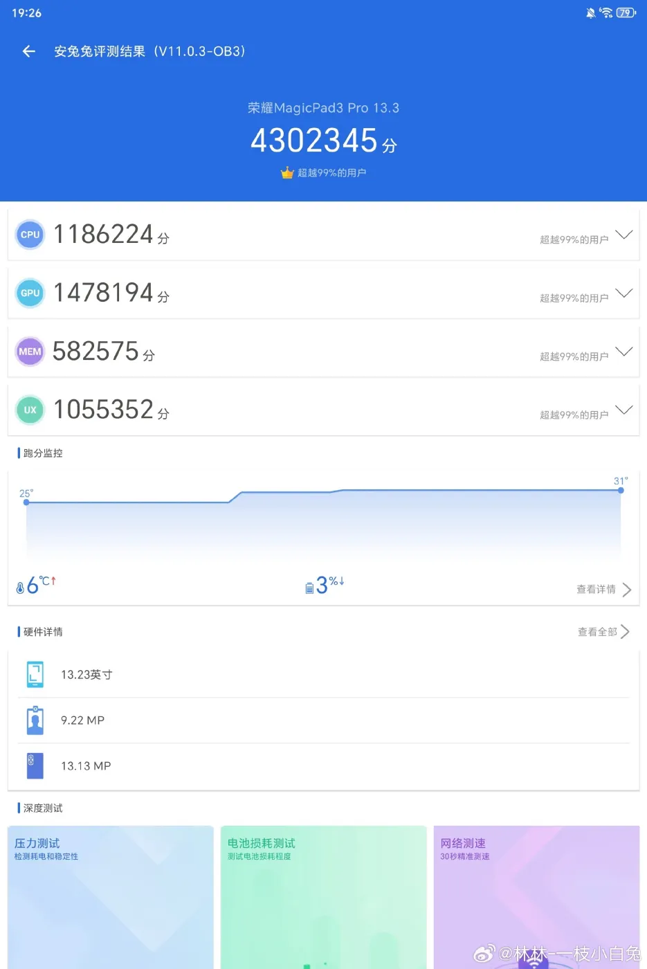 HONOR 的全場景產品負責人林林今天分享了 HONOR MagicPad3 Pro 的跑分,AnTuTu 成績突破 430萬,是現階段該擁有該處理器的裝置中跑分最高,也是現階段 Android 裝置中跑分最高,可以算作行業第一,HONOR MagicPad3 Pro 成為第一個與旗艦手機性能相當的平板。