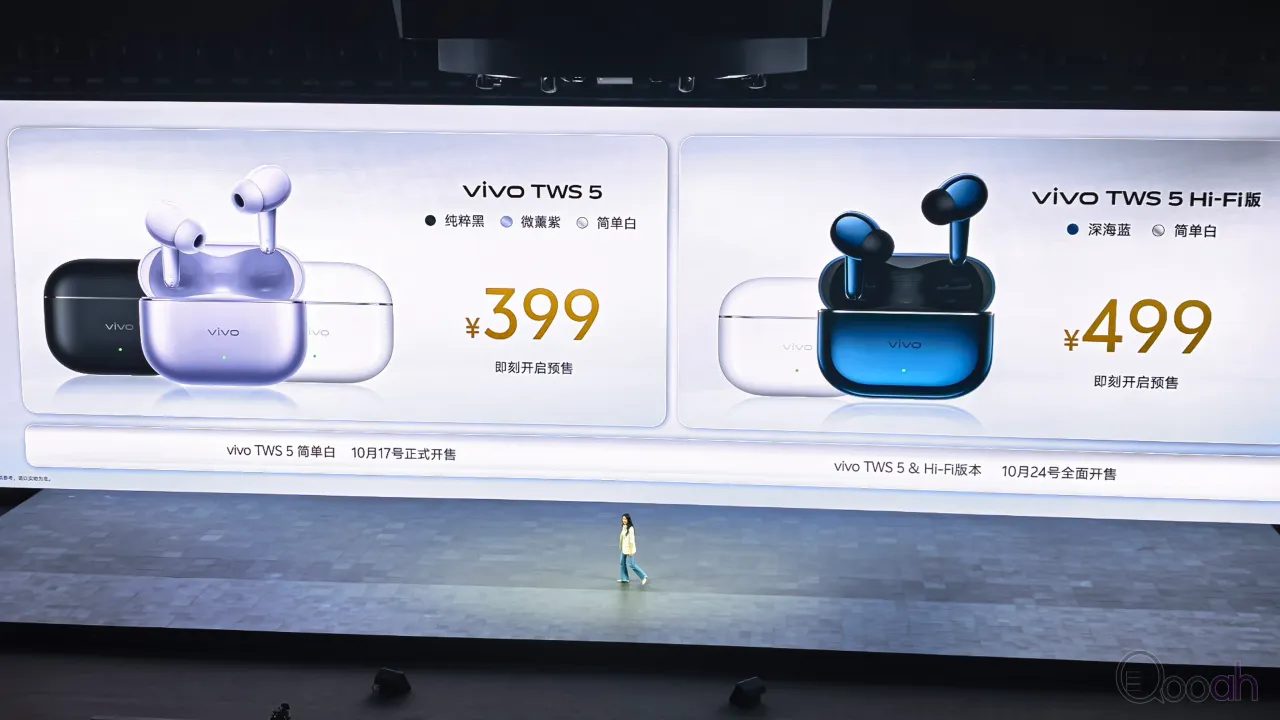 vivo TWS 5 耳機起售價399元,並將於10月17日正式上市。此外還推出了音質更出色的 Hi-Fi 版本,定價為499元,計劃於10月24日開售。這款耳機搭載的「深海智慧降噪」功能最高可達到 60dB 的降噪深度。