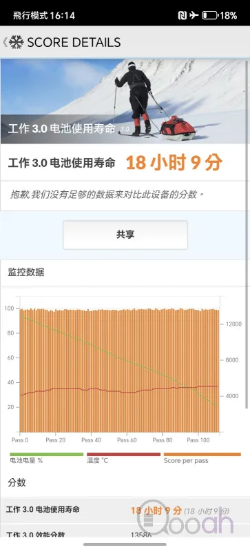 HONOR X9d 主打 8300mAh 超大電量,電量可以媲美行動電源,更支援 66W 快速充電,以 PC Mark 使用時間測試,結果為 18 小時 9 分鐘,使用時間比一般手機高出接近 1.5 倍。