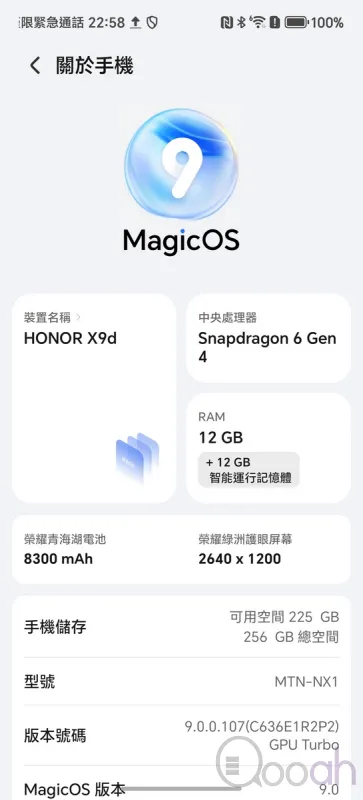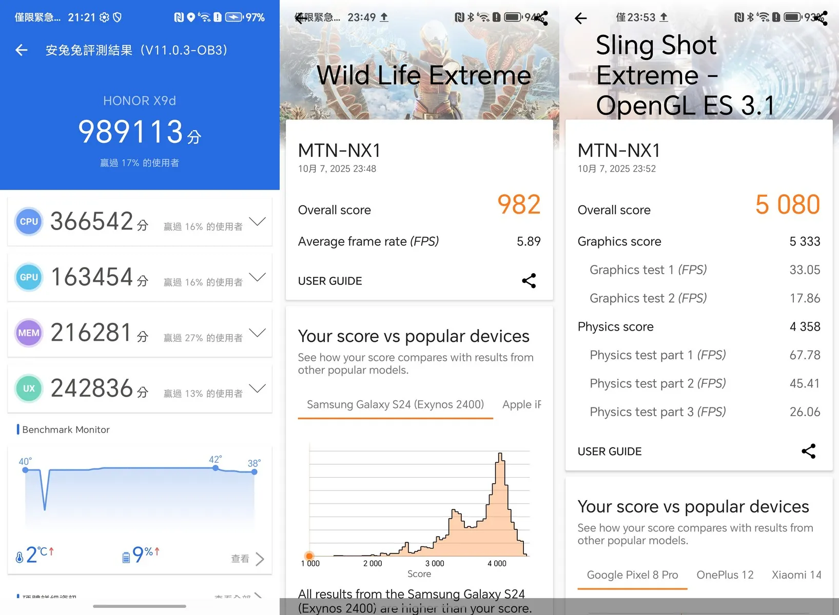 HONOR X9d 規格搭載 Snapdragon 6 Gen 4 處理器、12GB RAM 及 256GB ROM,Antutu 跑分達 989,113 分, 3D Mark Wild Life Extreme 及 Sling Shot Extreme 分別是 982 分及 5080 分,都有中低階 Android 裝置效能。