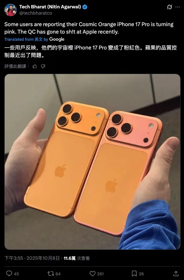 消息源 GSMArena 在10月18日發博文稱,有收到一些使用 Apple iPhone 17 Pro和 iPhone 17 Pro Max 的用戶反饋,用戶的手機機身發生了褪色的情況,褪色問題現階段主要體現在星宇橙和深墨藍兩種顏色的機身上。