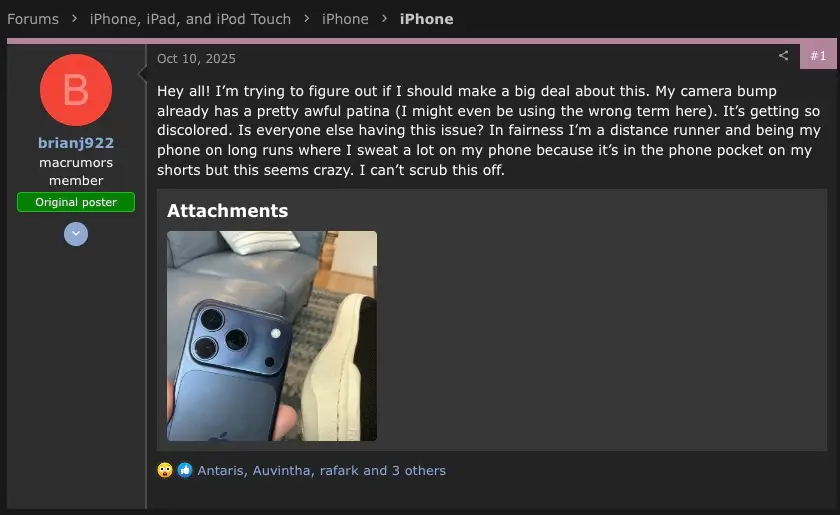 有用戶表示其星宇橙的 iPhone 17 Pro 變成了粉色,另一名用戶表示因為其是一個長跑運動員,經常將手機放在短褲口袋中,他的手機鏡頭凸起的地方現在看起來已經變得「鏽跡斑斑」,顏色幾乎都掉光了。綜合網上很多用戶的反饋詳述,能夠總結出一些共性,手機的顏色一般會先從鏡頭凸起的區域開始褪色,然後會逐漸蔓延到含鋁合金物料的機身,但手機背面玻璃面板的顏色不會發生變化。