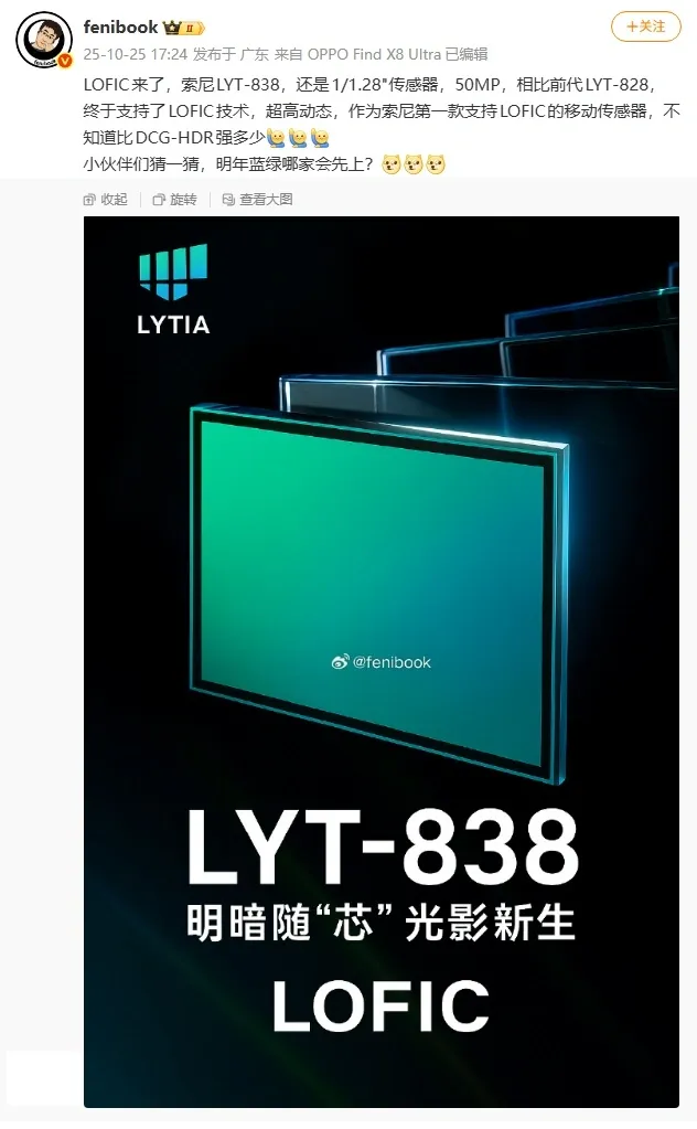 關於 LYT-838 的具體參數,搭載了 1/1.28 吋大底,像素為 5000萬,支援 LOFIC 技術,擁有超高動態,是 Sony 第一款支援 LOFIC 的 CMOS 傳感器,後續可能會在 OPPO 或 vivo 的新機中首發搭載。