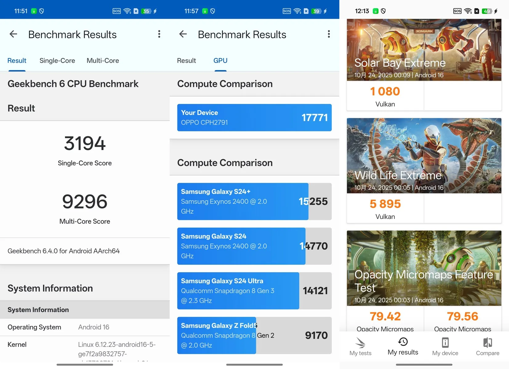 OPPO Find X9 Pro 香港版採用 MediaTek 天璣 9500 CPU、16GB RAM 與 512GB ROM,Geekbench 跑分成績,都達到 Android 智能手機的頂峰。3D Mark Solar Bay Extreme、Wild Life Extreme 及 Opacity Mircomaps Feature Test ,分別是 1080 分、5895分及 79.42 分,都有頂級手機的表現。