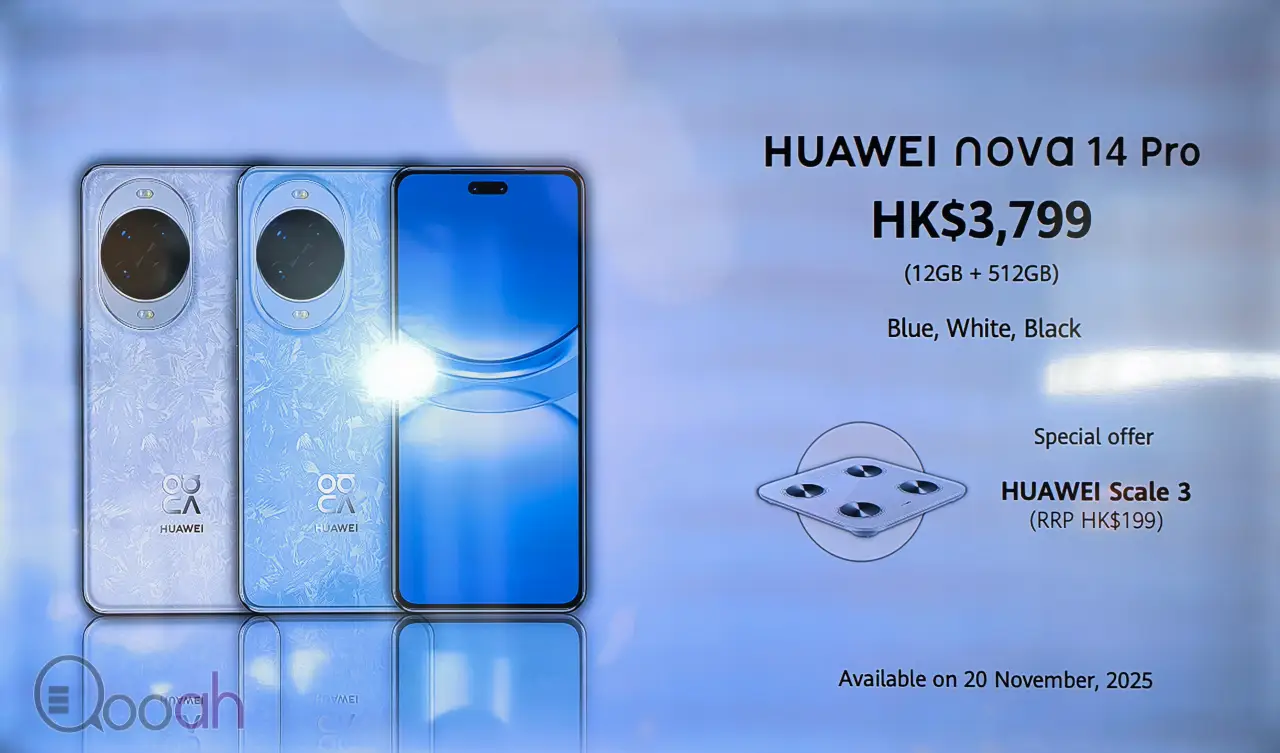 HUAWEI nova 14 Pro 的 12GB RAM + 512GB ROM 版本售價 HK$3,799。現購買送 HUAWEI 智能體脂磅(價值 HK$199)。