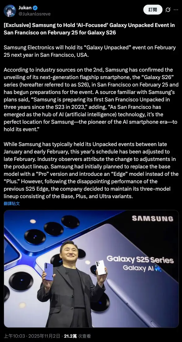 Samsung Galaxy S26 系列旗艦手機的「Galaxy Unpacked」全球發佈會時間與地點已曝光,計劃於 2026 年 2 月 25 日在美國三藩市舉辦,這是自 2023 年發佈 Galaxy S23 系列後,Samsung 時隔三年再度選擇三藩市作為發佈會舉辦地。