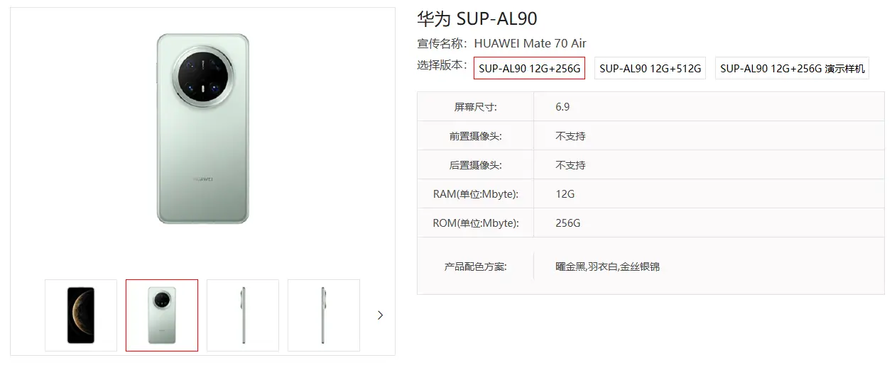 有網友進一步放出了 HUAWEI Mate 70 Air 的背部實拍圖,型號為 SUP-AL90,與電信終端產品庫中的 Mate 70 Air 型號一致。
