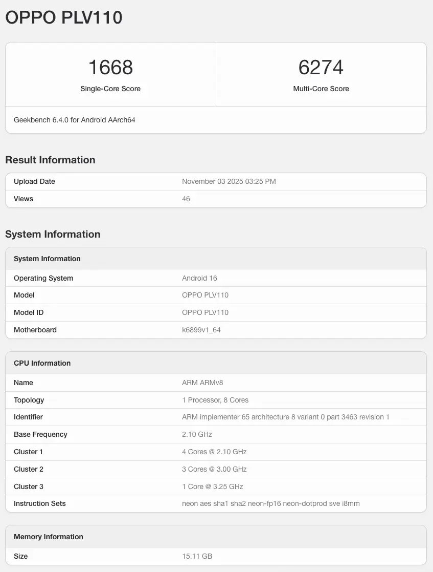 從 Geekbench 6.4.0 測試數據來看,該機型單核跑分 1668 分,多核跑分 6274 分,性能表現亮眼,單核成績與高通 Snapdragon 8+ Gen 1、Snapdragon 8 Gen 2 相當,多核成績則接近Snapdragon 8 Gen 3 水平。新機搭載聯發科天璣 8450 處理器,配備 16GB RAM(實際識別約 15.11GB),運行基於 Android 16 的 ColorOS 16 系統,主板型號為 K6899v1_64,CPU 為 8 核設計,包含 1 個 3.25GHz 核心、3 個 3.00GHz 核心及 4 個 2.10GHz 核心,支援多種指令集。