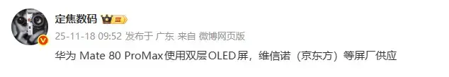 HUAWEI Mate 80 Pro Max 有了新爆料,該手機將搭載由維信諾、京東方等廠商提供的雙層 OLED 屏幕。這種屏幕採用 Tandem OLED 技術,其結構是在傳統單層 OLED 發光單元之上再疊加一層發光層,形成雙發光單元設計。