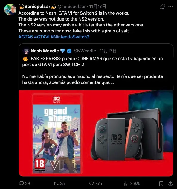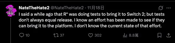 據 X 平台消息人士透露, Switch 2 版《GTA6》已在推進中,且該版本並非導致遊戲延遲的原因,僅可能晚於其他平台推出。另一位消息人士 Nate the Hate 補充稱,Rockstar Games 確實在進行移植測試,但測試並不等同於正式開發或發佈,目前尚不清楚測試的具體進展。