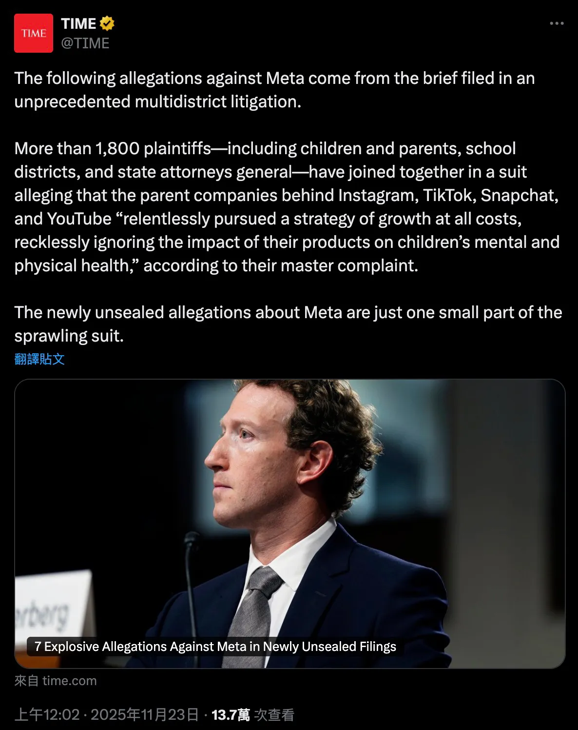 美國加州北區聯邦法院公開的訴訟文件揭露,Meta 公司為追求用戶增長,長期漠視未成年人安全風險,存在多項違規操作。超過 1800 名原告(包括未成年人及其父母、學區及州檢察長)聯合起訴 Meta、Snapchat 等平台,指控其「不計後果追求增長,無視產品對兒童身心健康的危害」。