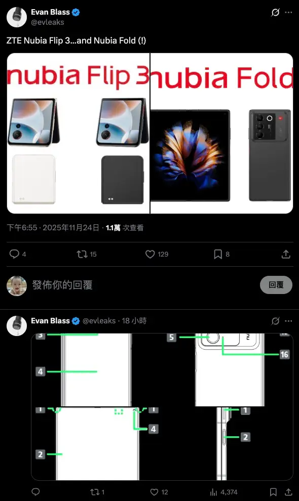 爆料人 Evan Blass(@Evleaks)在 X 平台發佈推文,曝光了 nubia 兩款全新摺疊屏手機 ——Nubia Fold 與 Nubia Flip 3,消息顯示兩款機型預計將於 2026 年第一季度正式亮相。