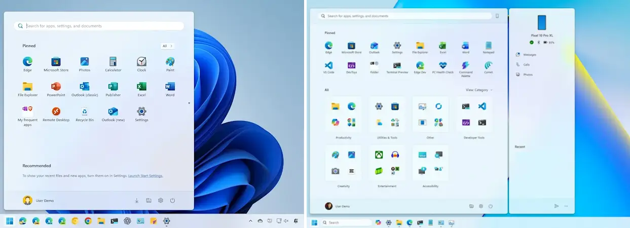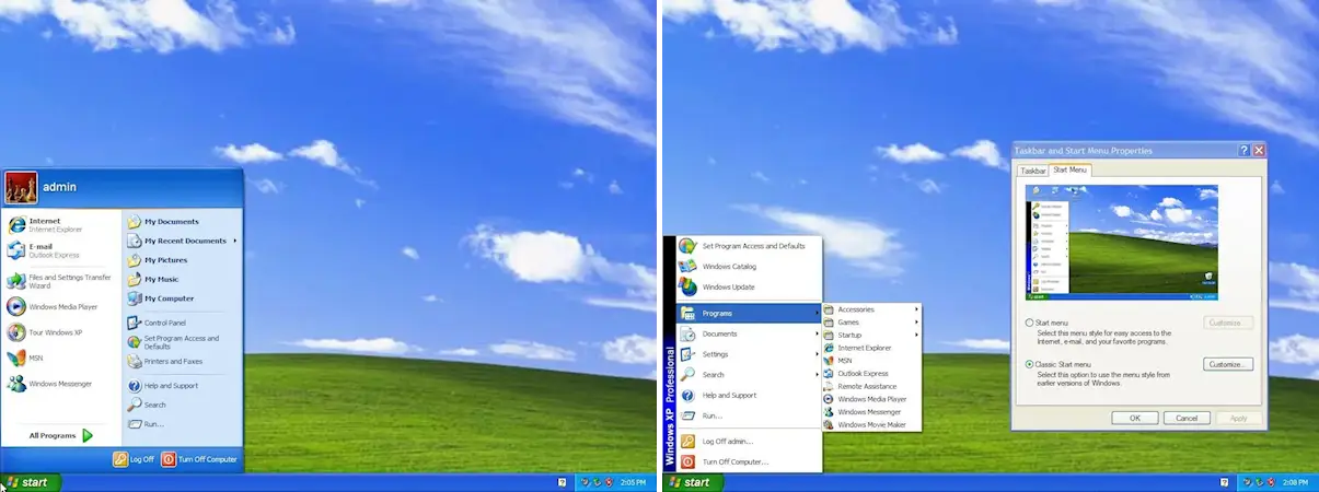 2001 年 Windows XP 帶來雙欄佈局革新,左側展示固定及最近使用應用,右側直達用戶文件夾與系統功能,還提供經典與新樣式切換選項,成為許多用戶的 「情懷經典」。