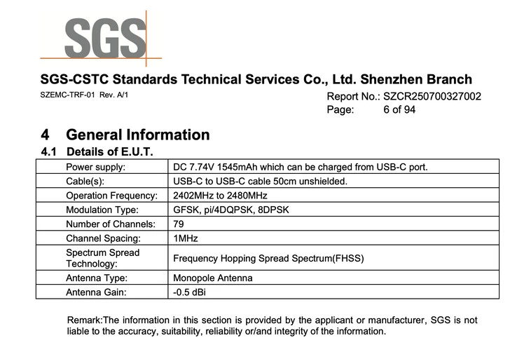 由於消費電子產品營銷常標注更高的「典型容量」(Typical Capacity),行業推測新機宣傳時或標稱 1600mAh 以上,用戶實際體驗的續航升級幅度將超 20%。文件還確認其支援低功耗藍牙(Bluetooth Low Energy, BLE)技術,為連接手機 App、無線麥克風等外設提供保障,但藍牙具體版本未明確,前代產品支援 BLE 5.2。