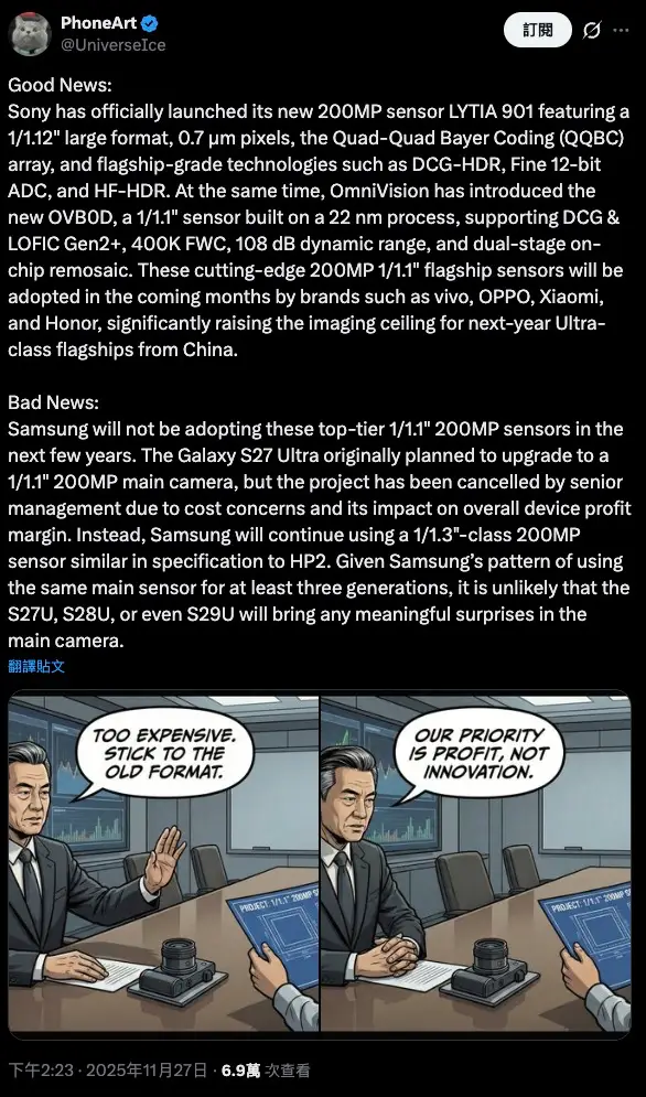 這一決策可能使 Samsung 在未來幾年面臨主鏡硬件升級滯後的局面。甚至有預測認為,類似策略或將延續至後續的 S28 Ultra 乃至 S29 Ultra 機型,從而導致 Samsung 旗艦在鏡頭這一關鍵硬件上逐漸失去競爭優勢。