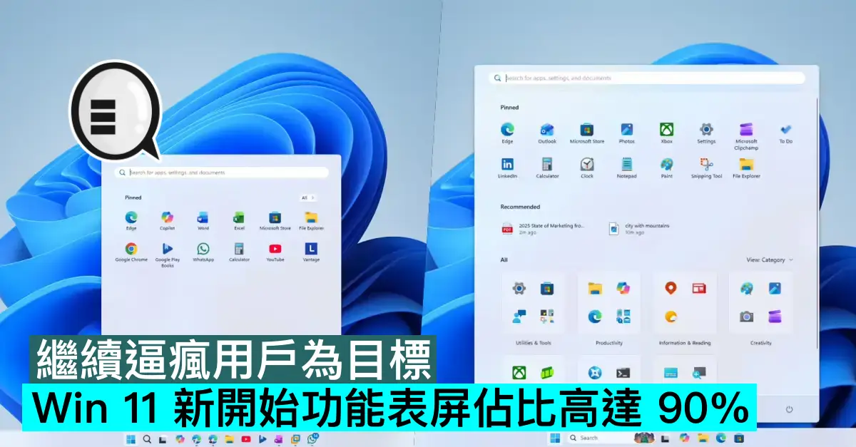 微軟在 2025 年 11 月向 Windows 11 用戶推送 KB5068861 更新,主要是提供了一個重新設計的開始功能表,有著更強的自定義功能,統一的應用視圖以及多種佈局選項。