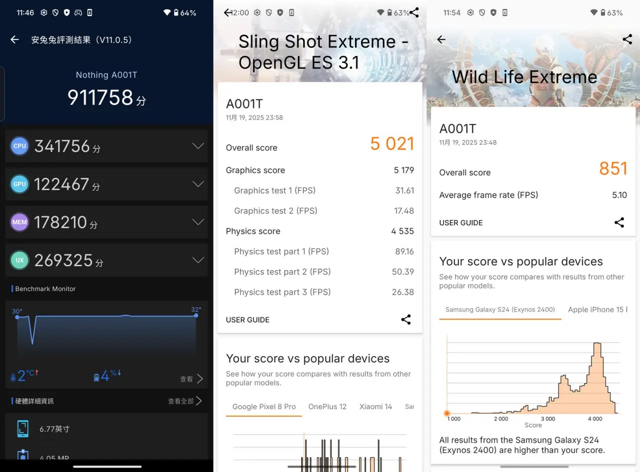 Nothing 3a Lite 規格配備 MediaTek Dimensity 7300 Pro 5G SoC、8GB RAM 及 256GB ROM,Antutu、3D Mark Wild Life Extreme 及 Sling Shot Extreme,分數分別是 911758 分、851 分及 5021 分,效能只算入面 Android 機規格