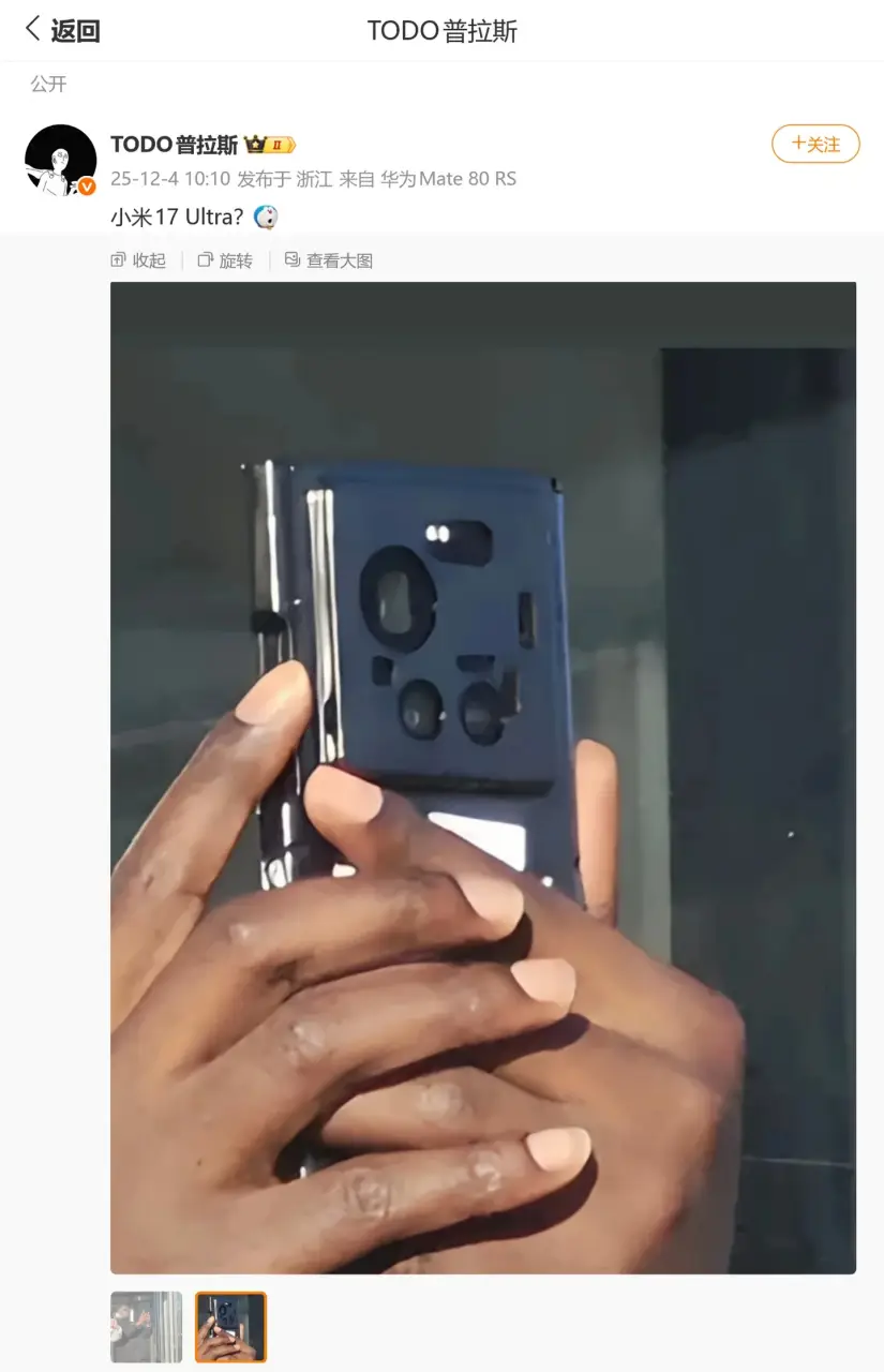 博主 @TODO普拉斯 發佈微博,向網友分享了一組手機照片,推測可能為小米 17 Ultra 旗艦。
