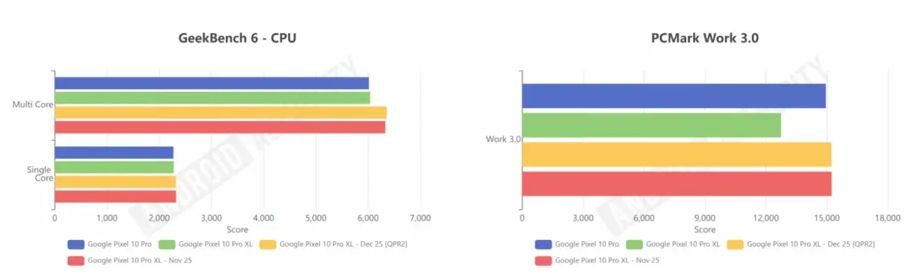 Androidauthority 使用 Pixel 10 Pro XL 手機進行測試,發現 CPU 的性能基準 Geekbench 6 單核提升2%,多核提升5%。