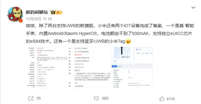 消息源 @數碼閒聊站 之前還透露過,Xiaomi 的全智能手錶會配備 Android / Xiaomi HyperOS 系統,搭載了 930mAh 電池,支援獨立 eUICC 晶片的 eSIM 技術。
