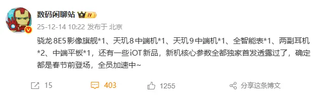 消息源 @數碼閒聊站 發博文表示,Xiaomi 將會有一大批新品準備發佈,有1x Snapdragon 8 Elite Gen5 影像旗艦、1x 天璣8系處理器中階機、1x天璣 9系處理器中階機、1x全智能手錶、2x耳機,1x中階平板,以及其他的 IoT 產品,這些產品都能夠確定會在農曆新年前推出。