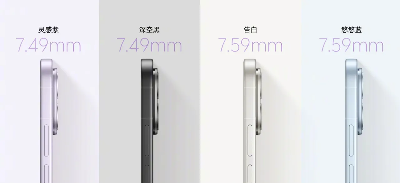 外觀方面,工業設計採用輕薄設計,機身厚度為7.49mm。提供靈感紫、悠悠藍、深空黑和告白等多彩配色可選。其中告白配色採用紗緞光刻工藝,可以隨著光線角度變換光彩,華麗夢幻。