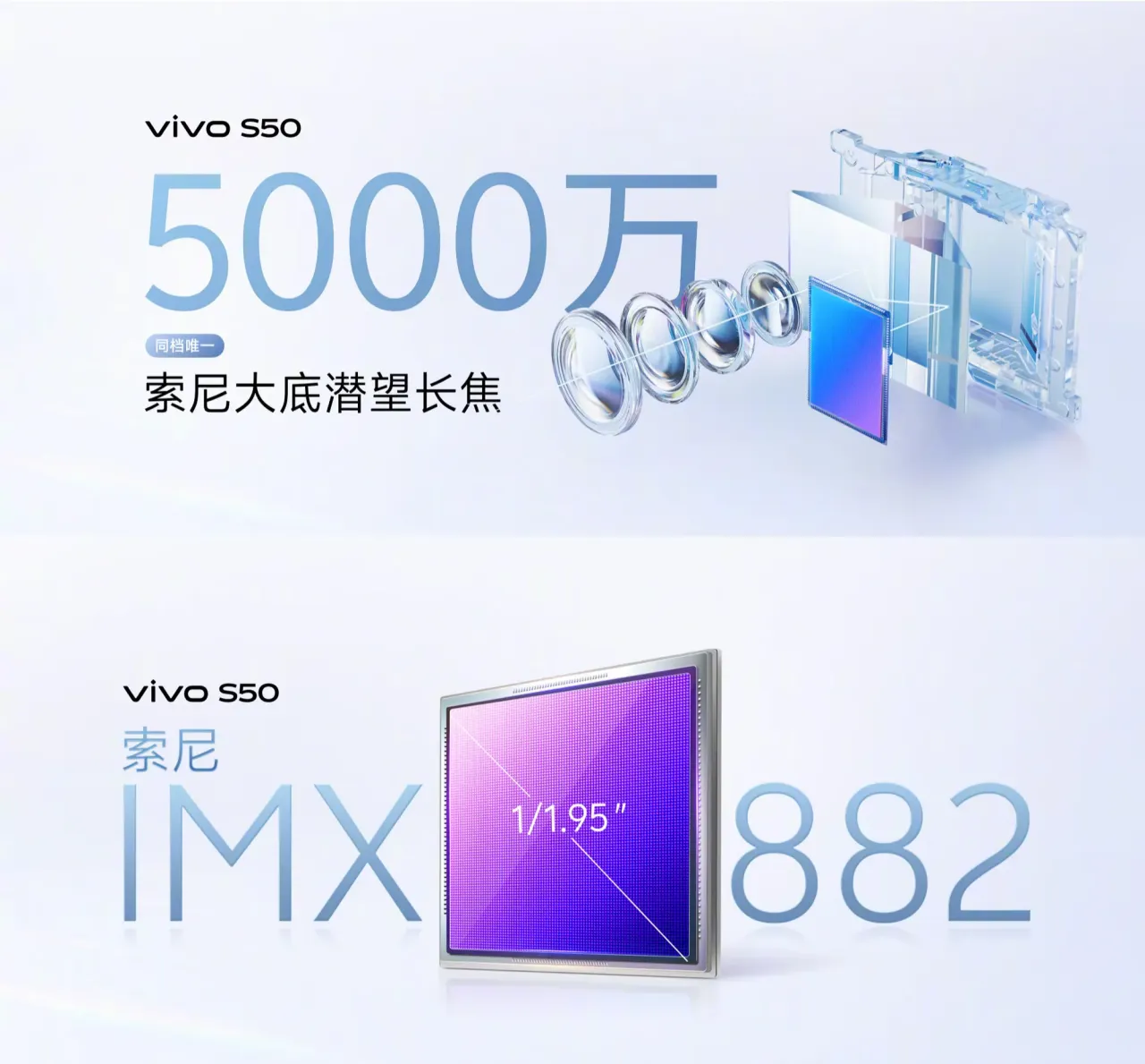 拍攝方面,vivo S50 採用前置 5000萬像素單鏡,後置 5000萬主鏡頭+5000萬潛望長焦鏡頭+800萬超廣角鏡頭。其中長焦鏡頭為 1/1.95吋大底,支援 3倍光學變焦、6倍高品質變焦,以及最高100倍變焦。