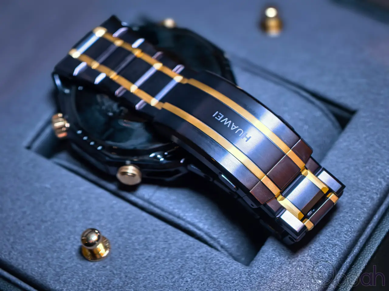 外觀方面,HUAWEI WATCH ULTIMATE DESIGN 紫金款表殼採用了業內首創的稀土紫色陶瓷錶圈搭配 18K 黃金鑲嵌設計,錶盤為藍寶石玻璃,更加耐磨。錶帶為航天級鈦合金材質+24K鍍金點綴,盡顯奢華。