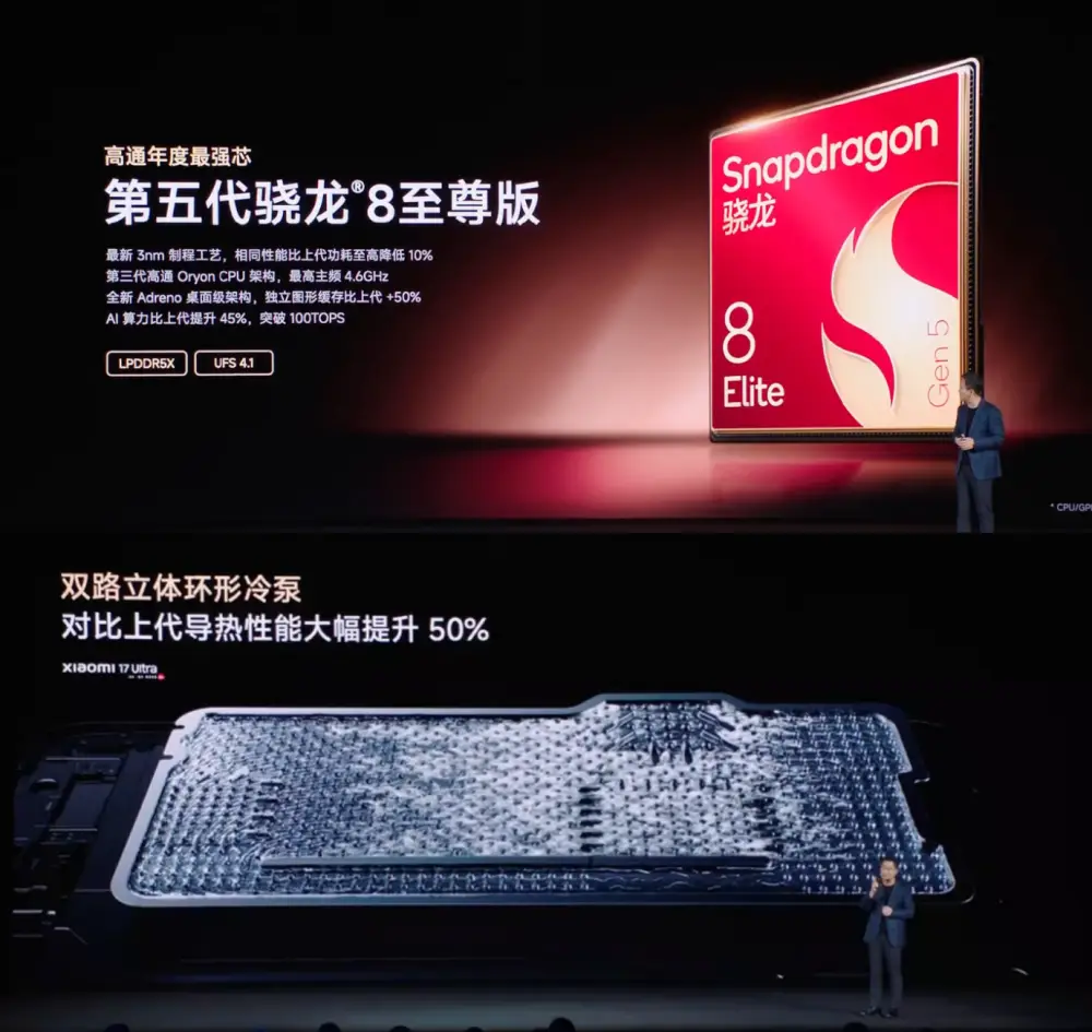 性能方面, Xiaomi 17 Ultra 搭載 Snapdragon 8 Elite Gen5 平台。散熱系統採用雙路自驅環形冷泵,並為相機模塊開闢獨立散熱路徑,整體導熱效率較上代提升 50%。