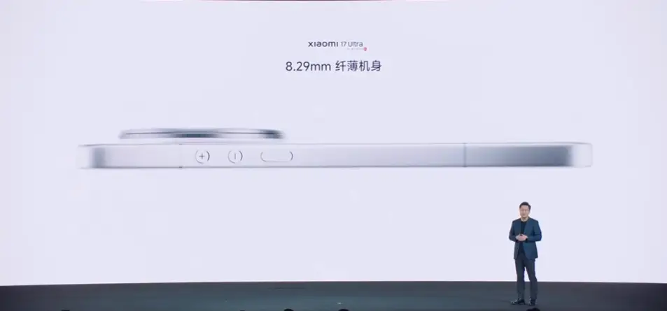 外觀設計上, Xiaomi 17 Ultra 厚度僅為 8.29mm,相比前代減薄超過11%,重量也控制在 223克左右。機身採用包裹式金屬中框,配備獨立圓形音量鍵,細節處融入了相機設計元素。後置攝像頭模組體積更小且位置有所上移,改善了握持時被遮擋的情況。新機提供黑色、白色、冷煙紫以及星空綠四種配色可選。