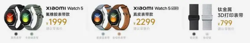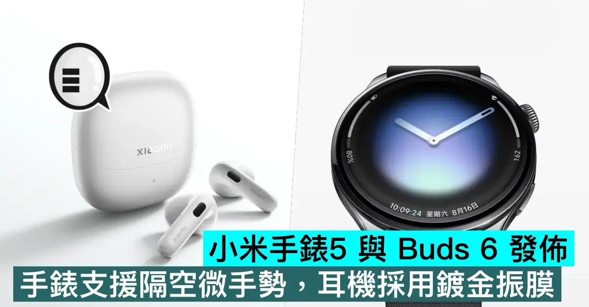 今天小米正式發佈了小米手錶5 與小米 Buds 6 耳機兩款產品。小米手錶5 提供藍牙版與 eSIM 版兩個版本,售價分別為 1999元與 2299元,另有一款鈦金屬 3D 打印錶帶可選,售價 799元(人民幣。下同)。小米 Buds 6耳機首發價699元。