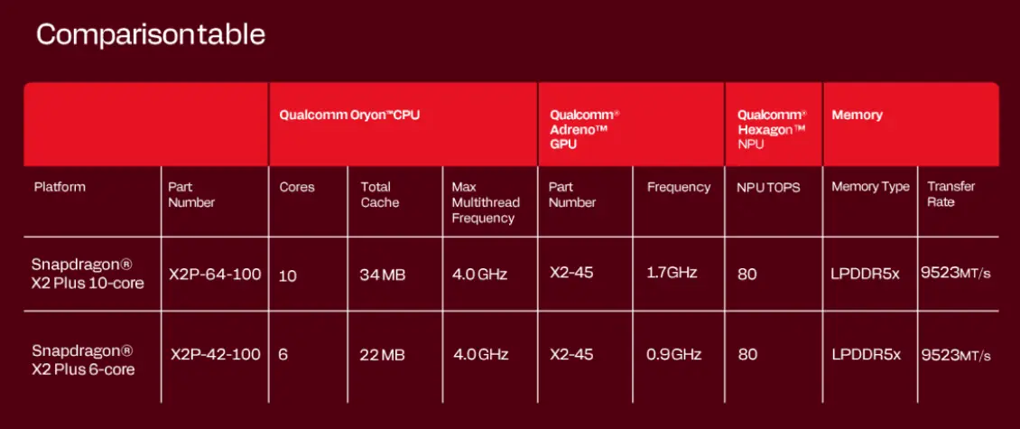 Snapdragon X2 Plus 提供了兩款型號,分別為 X2P-64-100(十核)和X2P-42-100(六核)。兩款處理器均為高通第三代 Oryon 架構,由台積電 N3P 3nm 工藝製程製造。