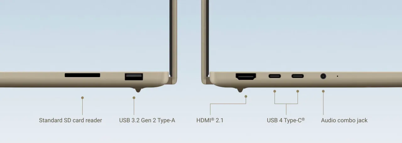 接口與連接規格全面,包含 USB 3.2 Gen2 Type-A、雙 USB 4.0 Type-C、HDMI 2.1、3.5mm 音頻接口及 SD 4.0 讀卡器,支援 Wi-Fi 7 與藍牙 5.4,傳輸速率與連接穩定性拉滿。內置 6 個揚聲器並支援杜比全景聲,搭配雙風扇輕量化散熱方案,兼顧音效體驗與運行靜謐性。