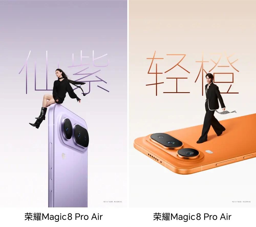 1月12日,榮耀手機公佈 HONOR Magic8 Pro Air 的四款配色,分別為優雅神秘的仙紫、鮮活靈動的輕橙、純淨細膩的羽白以及沈穩內斂的影黑。後蓋採用7塗7烤光感疊塗工藝,可以呈現出金屬緞光質感。