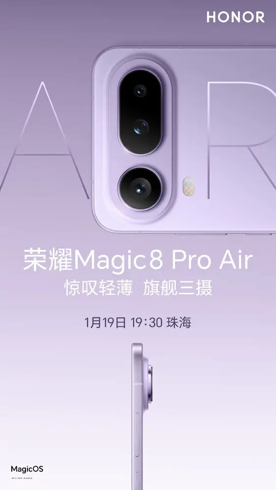 HONOR Magic8 Pro Air 確認將於1月19日正式發佈,主打賣點為旗艦性能與極致輕薄設計的相結合。