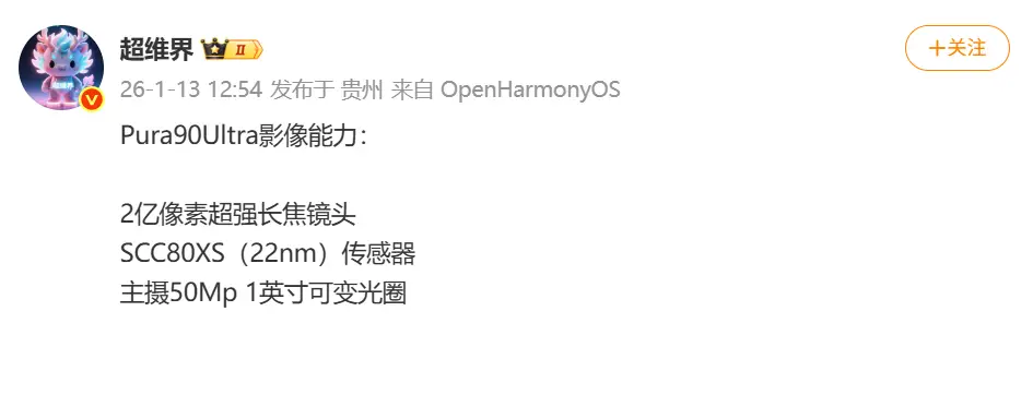 影像方面,HUAWEI Pura 90 Ultra 的後置會配備 2億像素超強長焦鏡頭,傳感器型號為 SCC80XS(22nm),主鏡則為 5000萬像素、具備1吋大底的可變光圈。