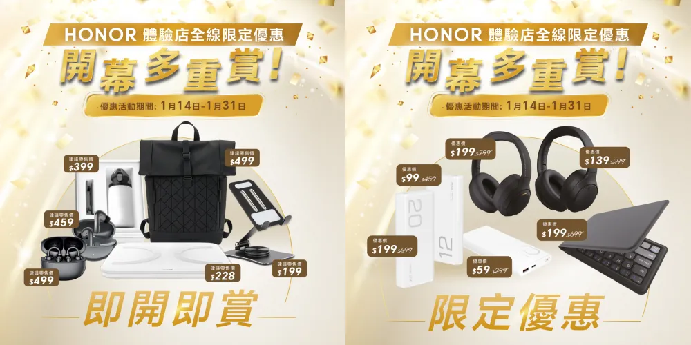 首日(1月14日)主角為 HONOR X9c Smart 智能手機,促銷價僅 HK$999(建議零售價 HK$2,299)。隨後每日依次推出包括 HONOR Watch 4智能手錶( HK$499)、HONOR CHOICE INFOWEAR Watch 2 Pro( HK$199)、HONOR Earbuds Open 開放式耳機( HK$599)等在內的熱門產品。整個搶購週期間,消費者還可隨時以 HK$19 的優惠價換購原價 HK$199 的 HONOR SuperCharge 快速充電組合(Max 22.5W)。
