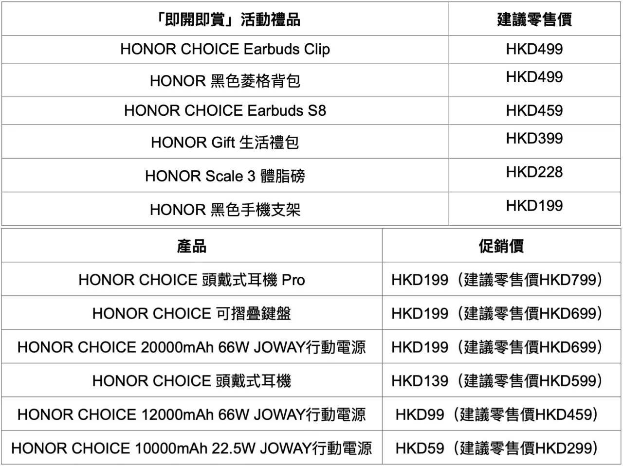 消費者在此期間購買任何手機、平板或電腦產品,即可參與抽獎,有機會獲得包括 HONOR CHOICE Earbuds Clip(價值 HK$499)、HONOR黑色菱格背包(價值 HK$499)等在內的多重精選禮品。此外,活動期間購買任何產品,均可享額外優惠換購多款熱門配件,例如以 HK$199 換購HONOR CHOICE 頭戴式耳機 Pro(原價 HK$799),或以 HK$59 換購 HONOR CHOICE 10000mAh 行動電源(原價 HK$299)。