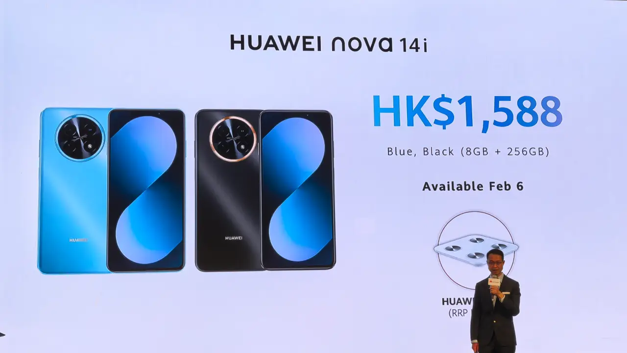 HUAWEI nova 14i 備有藍色及黑色配色,提供 8GB + 256GB 版本,建議零售價為HK$1,588, 將於 2026 年 2 月 6 日正式發售;有關銷售詳情請留意官方專頁公佈。