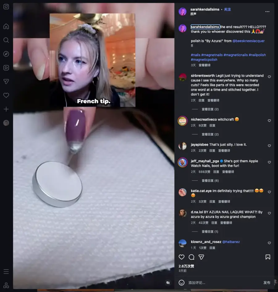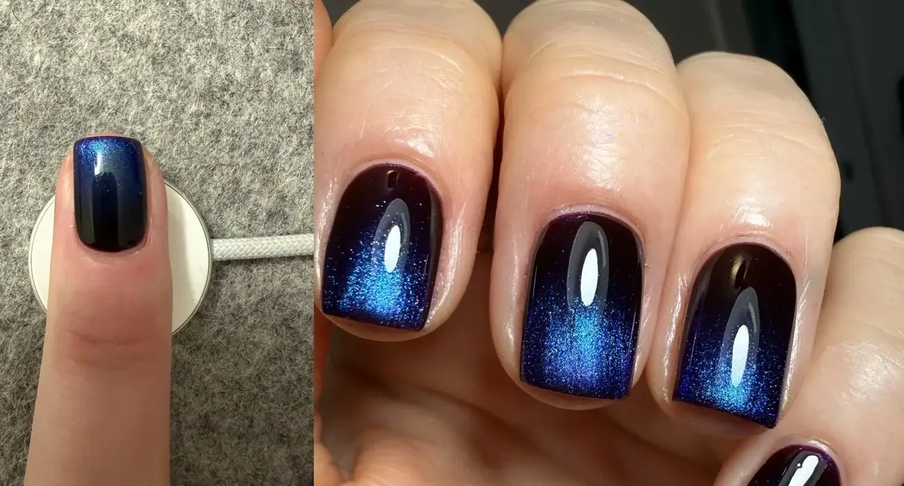 不同於傳統貓眼美甲使用的條形或 U 形磁鐵,Apple Watch 充電器的環形磁場分布獨特,能讓美甲呈現出更具設計感的紋理。社交平台用戶 @peninkling 詳細分享了操作步驟:只需將指腹輕按在充電器的磁吸面上,再塗上磁性指甲油,利用磁場讓甲油中的微細鐵磁性金屬顆粒沿磁感線排列、聚集,保持約一分鐘待甲油初步定型,就能獲得藍黑漸變的精美效果。用戶 Sarah Kendall 發佈的全流程影片,也證實了該方法簡單易行。