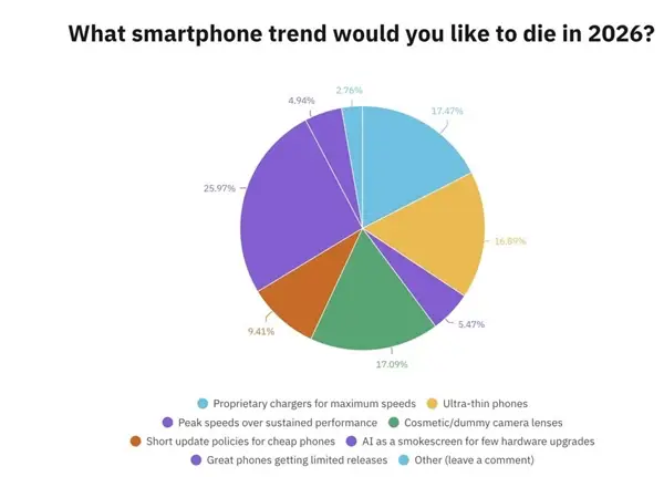 智能手機功能雖逐年迭代,但並非所有新趨勢都能獲得消費者認可。近日,知名科技媒體 Android Authority 發起「你最希望在 2026 年消失的手機趨勢」網絡調查,近 4500 名網友參與投票,揭露了用戶最反感的行業現狀。